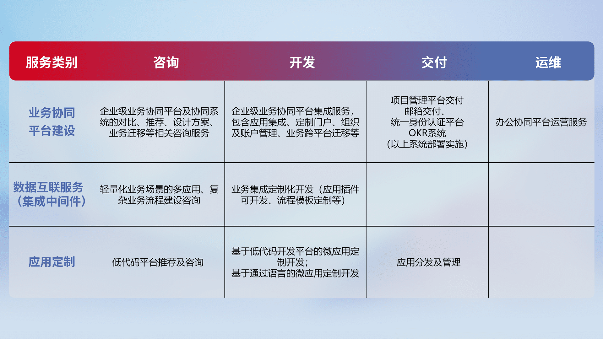 针对钉钉、、企微、、、IDaas等平台级产品提供产品的规划、、、、方案、、交付、、、、定制化开发等服务,,,实现如统一协同办公、、、智能客户服务、、、混合会议管理、、、、智能数据查询、、、等业务场景,,,,实现数字化转型。。。